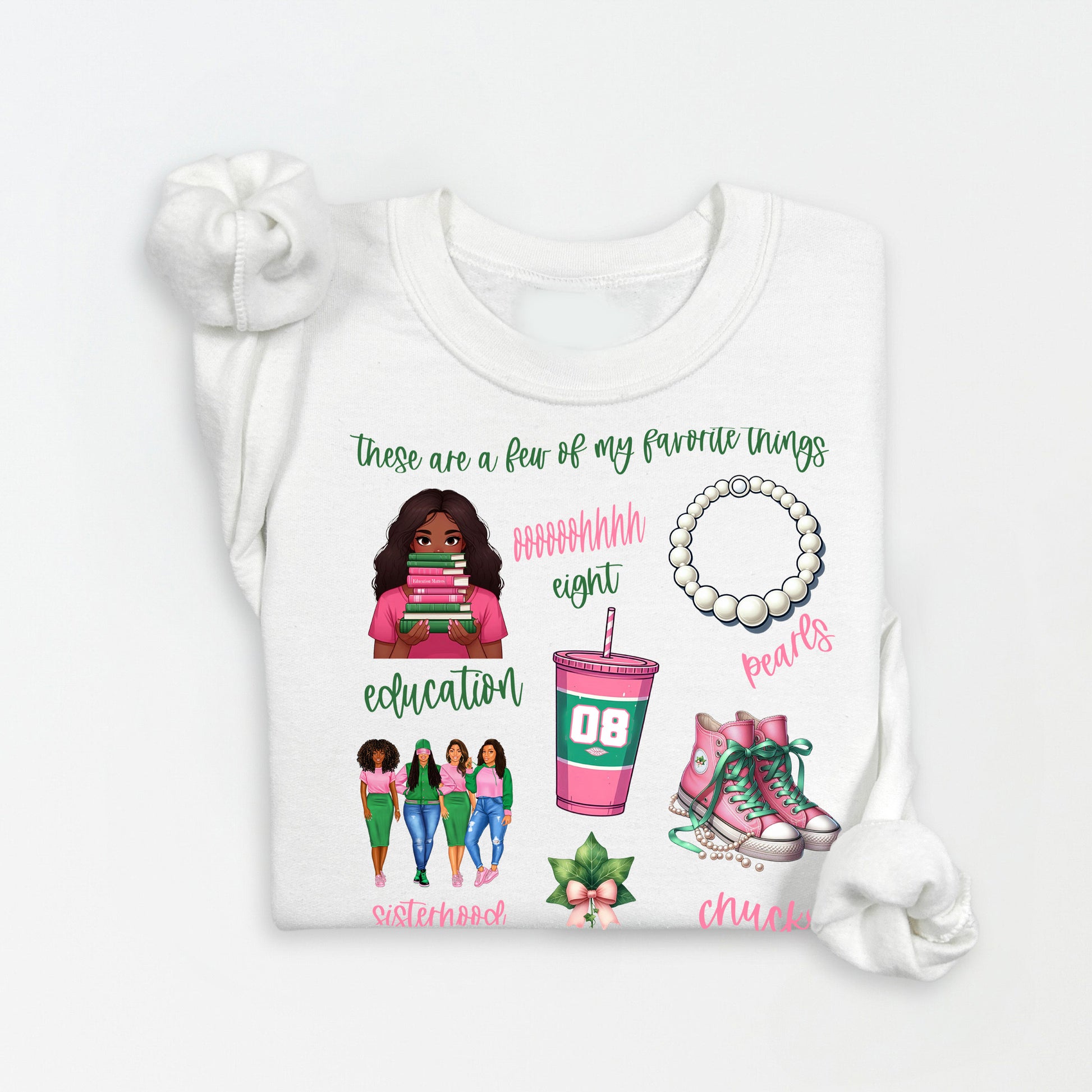 Celebrate your sorority pride with this playful Favorite Things sweatshirt, designed for AKA sisters who love their pink and green! Perfect for crossing gifts, line events, or everyday wear, this cozy sweatshirt lets you rep your colors in style. Available in soft shades of pink, green, white, and gray, it's the ultimate way to show your 1920 legacy. Whether you're heading to an event or just vibing with your sorors, this tee brings that signature AKA energy wherever you go. Comfort meets sisterhood!